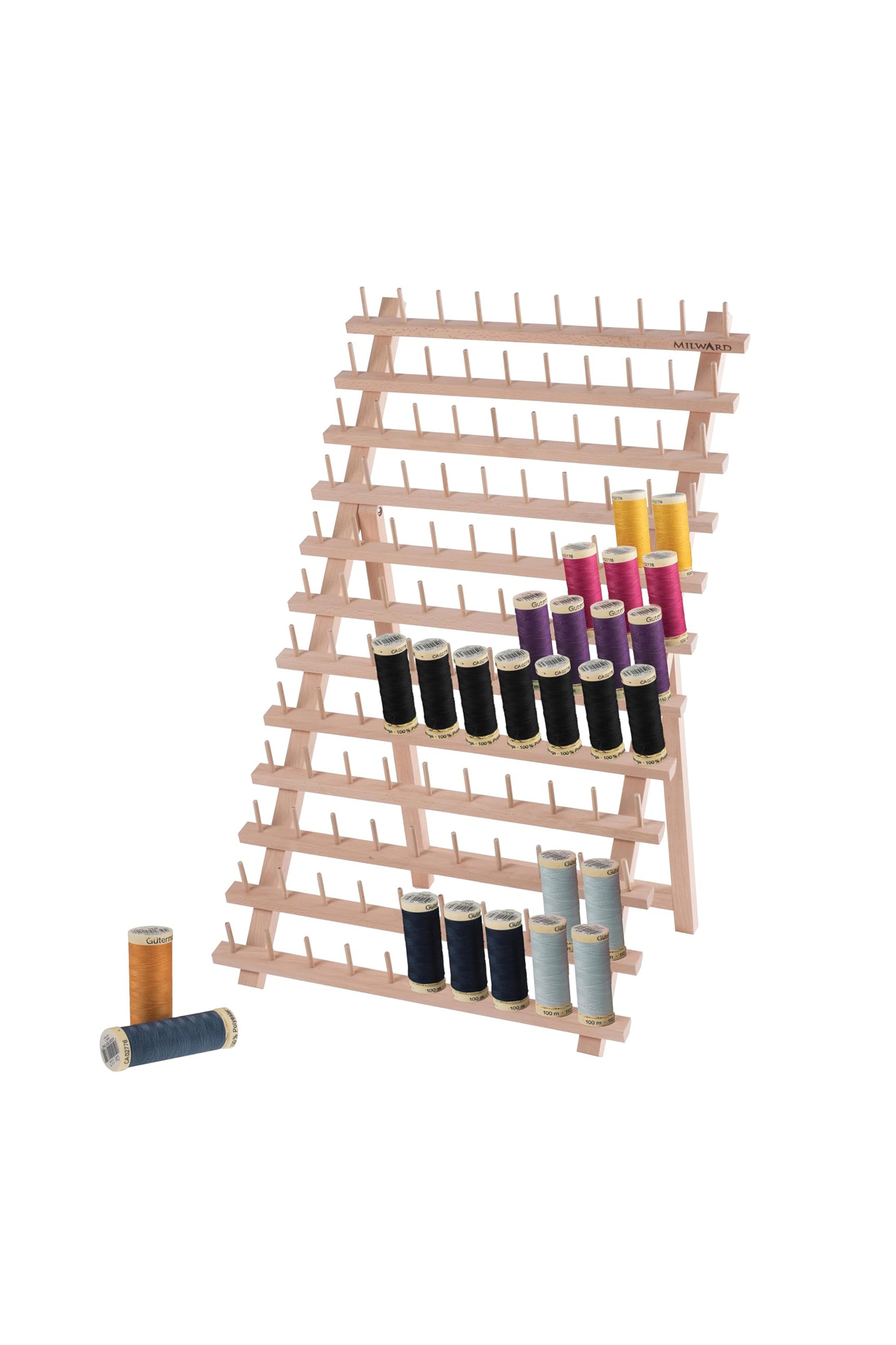 Organize your thread spools with elegance thanks to this wooden thread holder, both practical and stylish. Designed to hold up to 120 spools, it keeps your threads clearly visible, easily accessible, and perfectly organized in your sewing space.